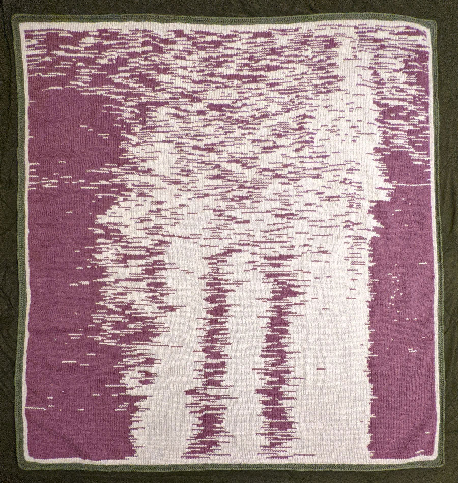 A visualization of my children's sleep pattern from birth to their first birthday. Crochet border surrounding a double knit body. Each row represents a single day. Each stitch represents 6 minutes of time spent awake or asleep